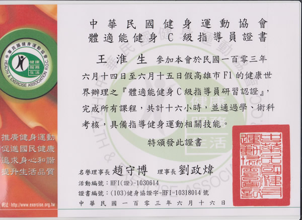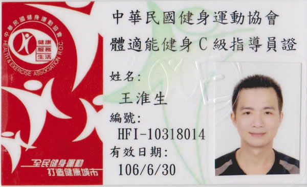本人為提升個人專業領域的知識,協助人們以正確的方式,達到身體的健康和體重管理,並得以改善人們生活方式傳遞出去,至今已協助許許多多的人成功的健康減重,調整體質,維持美好的體態。 參加『中華民國健身運動協會』之『體適能健身C 級指導員』認證合格。 欲了解『中華民國健身運動協會』之相關訊息,請直接與協會聯絡,謝謝!
